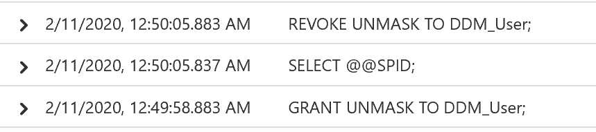To test the activity is captured, I grant and revoke UNMASK to a user. I'm pushing the audit logs to Log Analytics, which returns the rows as expected:
