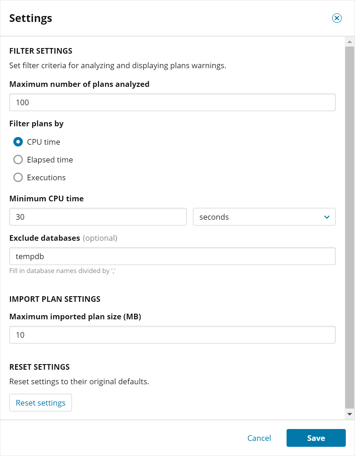 After you connect to your instance, SQL Plan Warnings will return the top 100 plans, with a default sort by CPU time. However, it is possible after connecting you may see no results. This is likely due to the default settings for SQL Plan Warnings. You get to the settings by clicking on the gear icon in the upper-right corner. Here is what the default settings look like: