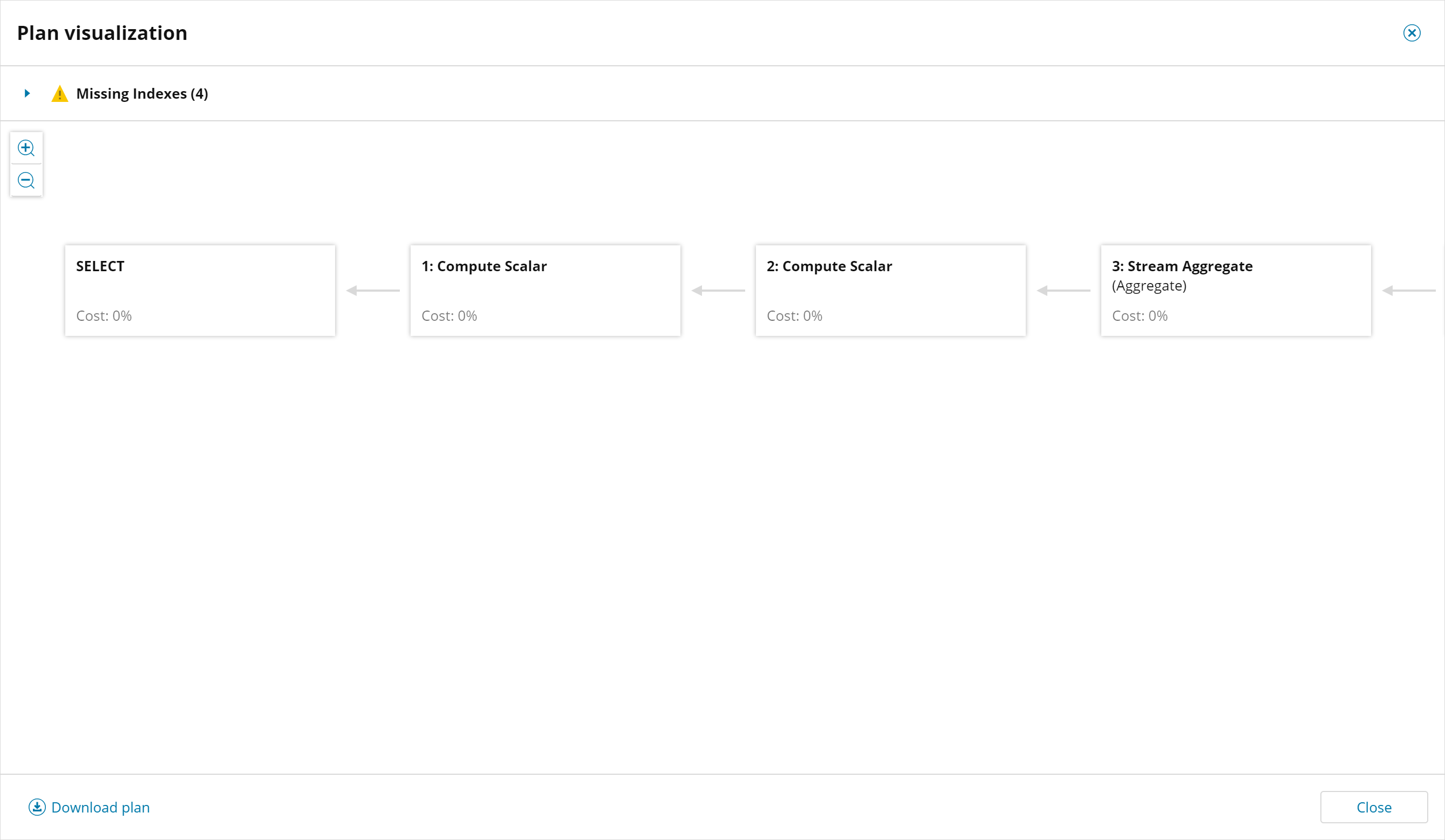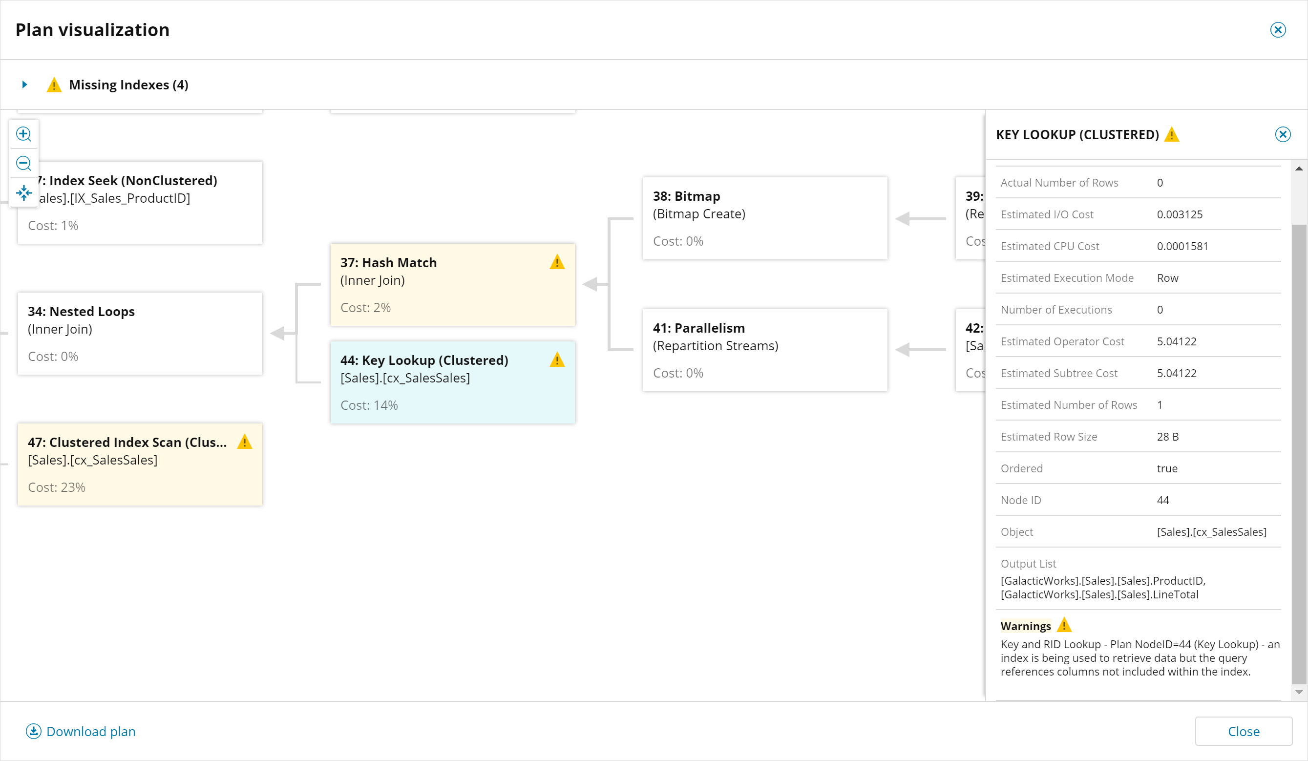 From here we are able to filter on a specific warning type with a simple click. This allows us to narrow our focus. Perhaps today we want to focus on Key and RID lookups. We select that filter, then open the plan: